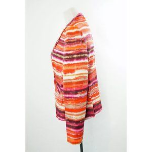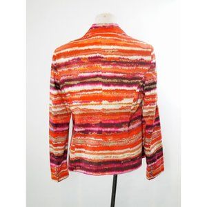 This gorgeous blazer by quality brand Jones New York feature vibrant shades of orange and pink in a beautiful watercolor inspired abstract design. Made with some minimal stretch, it includes extra buttons.