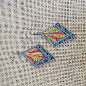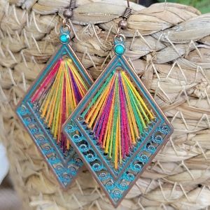 Delicate multicolor string on scrolled verdigris diamond shaped dangle earrings with bronze tone wires.