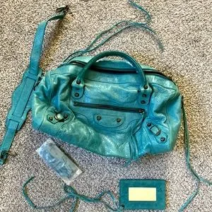The most gorgeous, barely used teal Balenciaga bag with all original accessories - including shoulder strap, extra tassels and wallet mirror. Antique bronze studs. Original retail was $2000, I just rarely use it. Serial no. 128523 3444