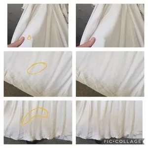 Standard Hem/Sleeve cuff coloration from wear. (Nothing noticable but if it looks a little dirty on the inside hem/hem its because it was used and although I don't see any noticeable dirt or markings at hem or cuff I just wanted to note the standard show of wear from original bride.
