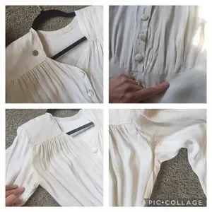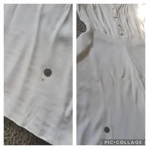 Four Sweat mark areas. One at both underarms, another near waist seam, and the other at both sides of the front bodice neckline. Darkest pit stain is at Right Underarm. The other sweat stains are faint and less/to almost unnoticeable. Picture shown of all sweat stains I can find. Honestly from the Front yoke down to the waist seam appears like its one big sweat mark. But I'm not confident. A simple wash would remove water marks and hopefully eliminate underarm sweat stains.
