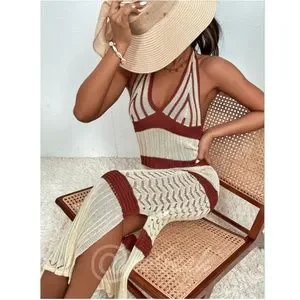 Long Beach Coverup Dress Beige and Brown Stripes Backless V-Neck Halter