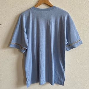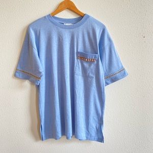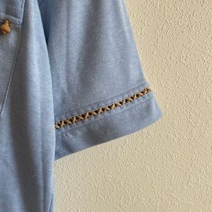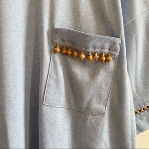 Has so many cute details. Wooden little charms on the pocket and thread on the arm and leg holes.