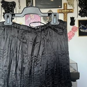 Beautiful tiered, ruffled, wrinkle skirt by Avant Garde in the 1990s! Features a satin feel, shine, and a delicate amount of sequins. Labelled size M, but the adjustable tie at the waist gives flexibility from a 14" to 20" waist. Can be worn as a maxi skirt, low-waisted.