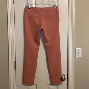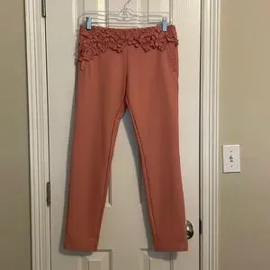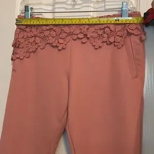 Classic trousers, floral lattice accent, normal waist, zip and button closure on the side, slit pockets at each side on front and back (decorative), stretchy material.