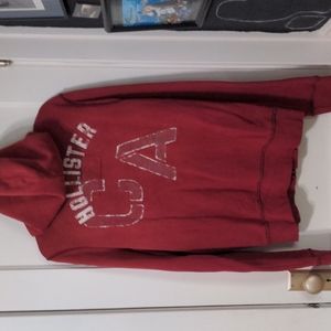 this is a Hollister size medium red zip up hoodie with drawstring Hood it's been worn but it's still in really great shape and it's really warm there is a small little snag hole on the right arm and a little tiny dot of discolor on the left arm.