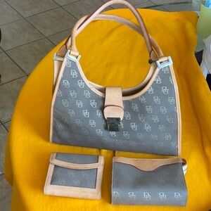 This listing is for a preowned Dooney & Bourke 3-Piece Set of Vintage Taupe Signature Canvas and Tan Leather Shoulder Bag, Cosmetic Bag, and Wallet. Please look at all pictures, one shows the handles that need conditioning since it has been in storage, and ask any questions that you may have.