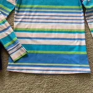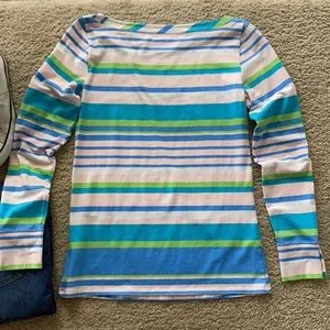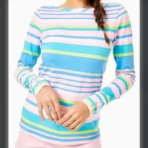 Lilly Pulitzer Aleah Top. Super cute stripes in blues, greens, pinks. Boat neckline. Buttons at the cuffs. Long sleeves. Laying flat approx 24” shoulder to hem, approx 16” pit to pit. 95 cotton 5 spandex. Size S. Excellent condition.