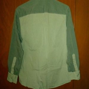 EUC Two Toned Gray Button Down Shirt. This shirt has a button down collar that has the two grays on it. The sleeves are the dark gray and the cuffs are light gray The cuffs have 2 buttons to adjust for your fit. There is a drop in chest pocket where the dark gray piece is. The inside of the collar has light gray and cream lines.