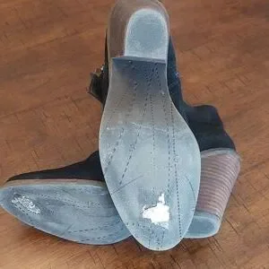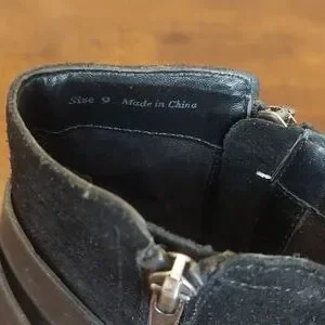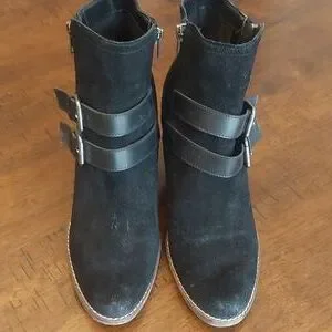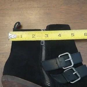 These are in excellent used condition. They are black suede with a lightly distressed look. There are black faux leather straps and antiqued buckles decorating each boot. There are also 2 zippers on each boot which are both functional.