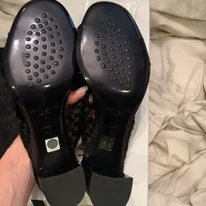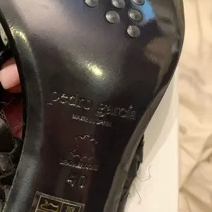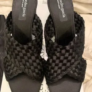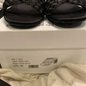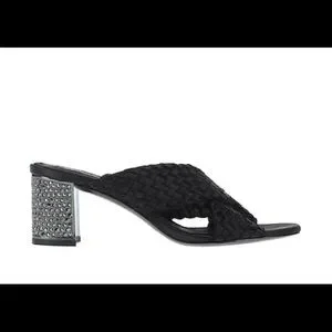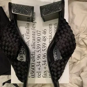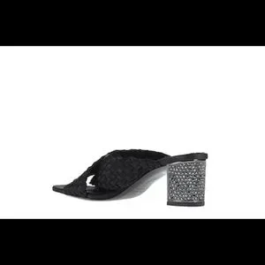 Brand new, never worn. GORGEOUS sandal with black Swarovski rhinestone encrusted block heels. They are so sparkly and elevate any outfit! Comes with extra crystal, dust bag and original box.