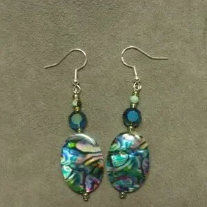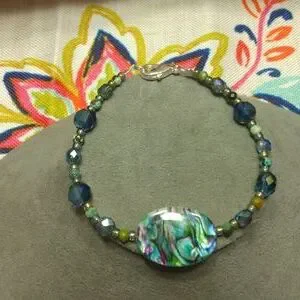 Faceted turquoise beads with faceted glass beads and freshwater pearls, shell oval beads. Sterling silver plated earwires. Bracelet is 8" long.