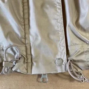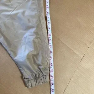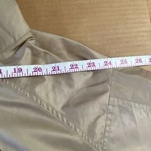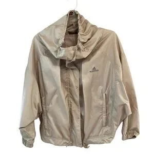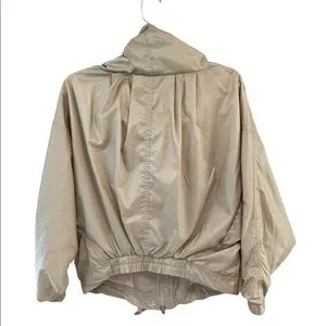 EUC. Color: tan with gray logo. Full zip, lightweight, elastic at back. Adjustable cowl neck. Two front mesh zipper pockets. Elastic wrist cuffs. Mesh lining. 100% polyester.