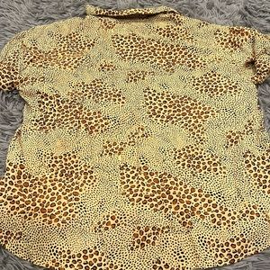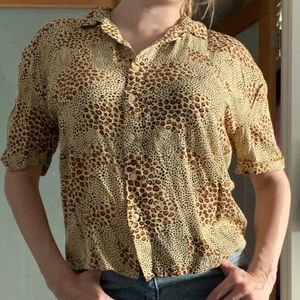 Safari animal print short sleeve button down bowling tee. Cropped length. Rolled sleeve. Boxy and oversized