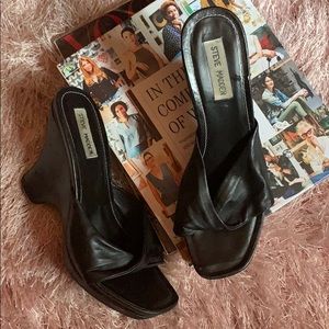 These black leather wedges are the ultimate accessory. Dressed up or down you cannot go wrong with these shoes. Slight wear on the heel has been captured.