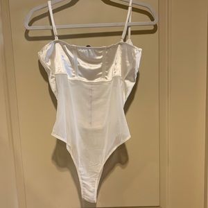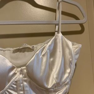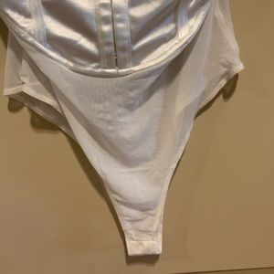 This sleek satin bodysuit has a structured corset bodice, adjustable straps, and a mesh lower construction. Dolls Kill Fashion Wildcat satin & mesh bodysuit in white.