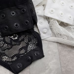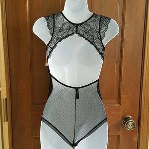 Lace bodysuit in black. Ivory white sold separately, is in some pictures above. Snaps underneath, 2 rows for good fit, pics 7. Deep V front, high in back with large oval opening mid back. Front and upper back are lace, lower back is mesh. Bust is lined, no padding or wires. Can be worn with or without another top layer.