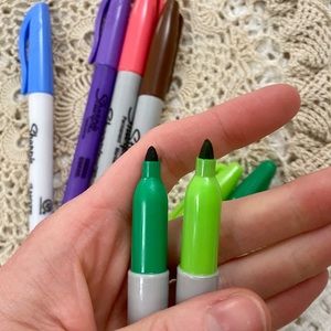 -Regular fine point in green, lime, brown, and salmon-y pink