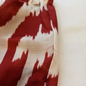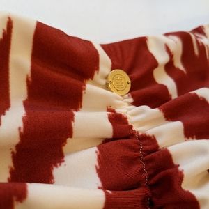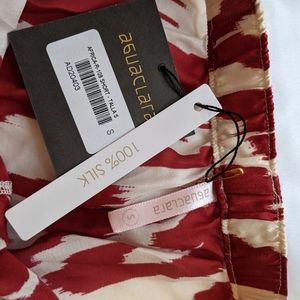 The top has a large bow in the back that can be used to adjust fit. Bottom features small gold decal with runched design, and the shorts coverup is 100% silk.