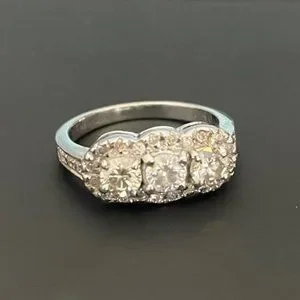 3 Round Brilliant Cut diamonds across the center weighing approx. 1.00ctw in (SI1) Clarity and (J-K) in Color, pring set. Bead set around the outside on the ring are (20) Round Cut diamonds weighing approx. .25ctw in equal clarity & color. The ring weighs 2.8g. Estiated replacement value from appraisal $3,850.