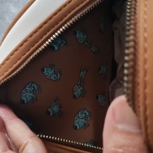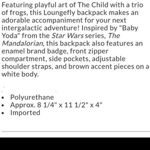 New Loungefly Disney's Star Wars The Child Mandalorian Baby Yoda and frogs mini backpack. Front zip pocket and a pocket on each side, double zip main closure and adjustable straps. See pictures for more details and measurements.