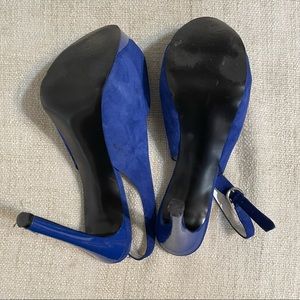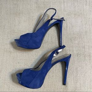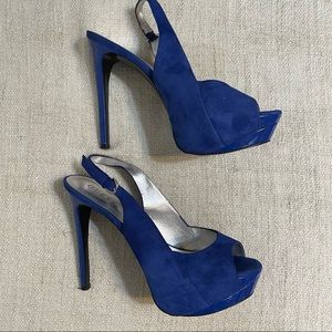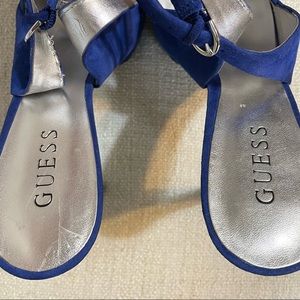 Pre-Owned Guess Heels in a size 9. Blue suede like material. Buckle straps. Straps are a little bent but should be fine when wearing. Open toe. Some signs of wear but plenty of life left.