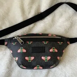 Gucci Bestiary belt bag with bees. Classic black Gucci canvas print with green bee motif. Adjustable strap. Can be worn across the chest or as a fanny pack.