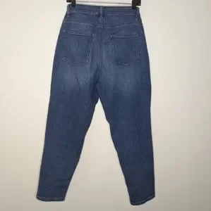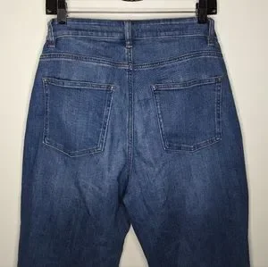 Eileen Fisher denim jeans; may be rolled up or down. Mid rise; belt loops. Five-pocket style. Tapered fit; straight legs. Cropped above ankles. Button/zip fly-front. Organic cotton/spandex. Machine wash. Imported.