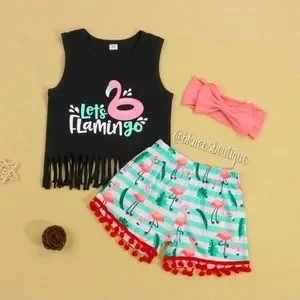 Set Includes: βLetβs FlaminGOβ graphic tank tee, matching flamingo tassel shorts & headband.