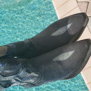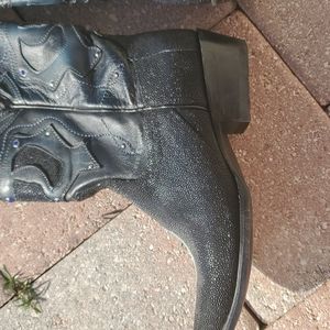 gorgeous unique stingray boots with rhinestone and stud detail by Los Altos period these are a size 8 snip toe worn several times with mild wear throughout and light fading on the very tiptoe. there is a white mark on the side. please see pictures. these were very expensive brand new and they are just never worn anymore and taking up space in my closet period smoke free but not pet free home and I do not have the original box. These were bought in Nashville many years ago.