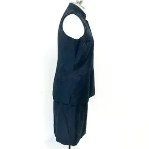Rare Designer Petite! Vintage 80s Christian Dior formal knee-length skirt & sleeveless jacket. Dark navy jacquard - shine reveals subtle champagne metallic roses floral print. Longline high neck - room to custom tailor. Fab for mother of the bride, evening party attire. NWT Unworn