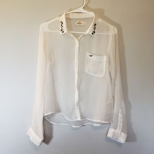 Beautiful Hollister Sheer White Button up Blouse with Jewel Collar Design and Optional Roll and Button Up Sleeves. Size Small