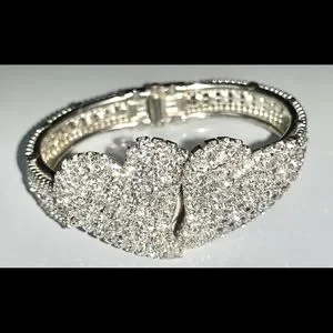 Vintage rhinestone hearts silvertone, clamper, cuff, bracelet, approx 7 inch wrist size (pre-owned)