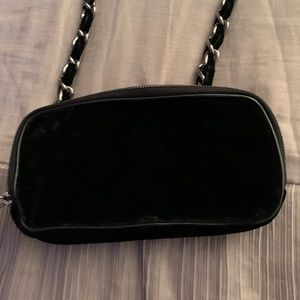 Small velvet Dolce & Gabbana purse. In pristine condition no defects, stains with dark gray hardware, logo and kiss closure. It hangs 22” top to bottom and is 9” wide. Has two sections one zipper closure and the other is kiss closure. PRICE IS FIRM!!!!