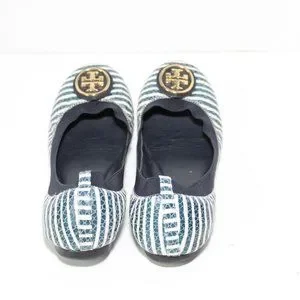 Tory Burch Caroline 2 Striped Ballet Flats Navy White Gold Shoes Size 7.5 H13069