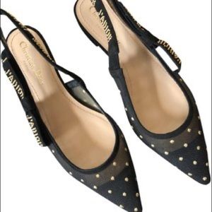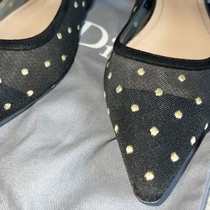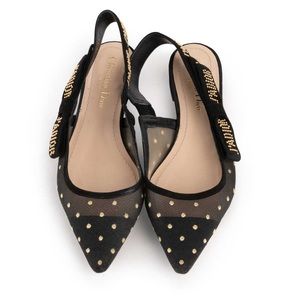 AUTHENTIC "J'Adior" flats crafted in mesh and designed with gold thread embroidered polka dot detail and suede J'adior studded ribbon slingback strap. Features pointed toe cap and made in Italy.