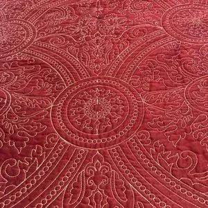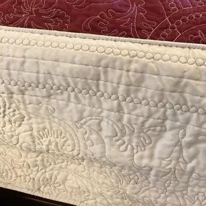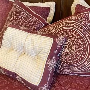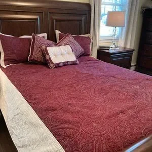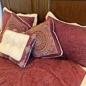 Queen size red & cream bed spread w/ 2 pillow shams and 4 throw pillows