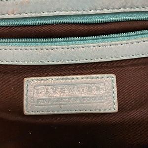 Beautiful Rare Levenger Turquoise Backpack. Two front zipper compartments to include a built in organizer in front bottom zipper compartment. Two zippered compartments inside the backpack with clear business card holder and two pockets on each side of the backpack for water bottles, etc… Silver hardware and all zipper pulls have “Levenger” stamped into the leather.
