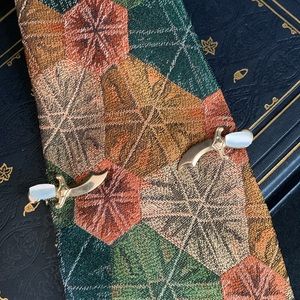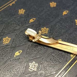 Vintage gold tone metal SLICK tie clip with Mother of Pearl daggers / knives. Clip measure 3 1/4โ Wide.very good vintage condition! Thanks for looking! ๐