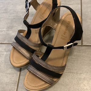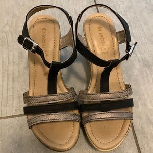 These light weight pretty Italian wedge shoes are a size 7 and they were bought in Italy. They’ve been gently worn maybe three or four times but in great condition. Adjustable strap.