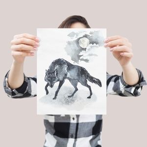 TAGS: Watercolor Wolf Print, Wolf Portrait Art Print, Cute Wolf, Woodland Animals, Winter Animals, Black Wolf and Full Moon