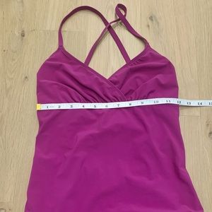 La Blanca One Piece Bathing Suit. Size 10. Simple yet sexy strappy tie back. Adjustable self tie straps. Surplice v-neck. Ruching/gathering around bust. No defined waist for an elongating look. Low cut, open back. Moderate rear-end coverage. Sliming, smooth, stretchy. Lined front. Opening in lining for removable cups (not included). 73% nylon, 27% lycra spandex. Solid color. Plum/berry/purple. Flirty, elegant, timeless, classic, slightly cheeky, swimsuit, mom bathing suit, sporty, beach, vacation, cruise, ocean, pool, crisscross, x back, supportive, sleeveless, swimwear, full piece, empire waist. Excellent pre-owned condition besides a few loose threads. Elastic in good condition (not dried or stretched out). No pilling, no stains etc.