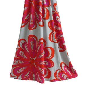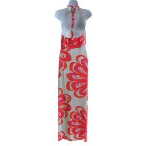Vintage 90s Y2K Maxi Boho Babydoll Dress. Mod Floral Surplice Halter Backless Padded Stretch Knit. Elastic Back for No Gap Fit. Reddish Orange Pink Ecru. Machine Wash. Strethcy Rayon Spandex Blend. Made in USA. Tagged Size M.