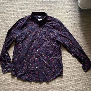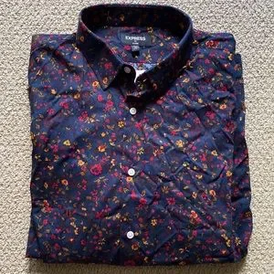 NWT Express mens floral long sleeve button down. Navy base with maroon, eggplant and mustard color flowers