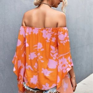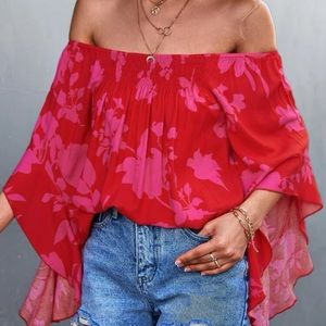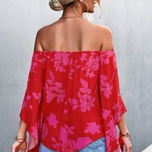 Off the shoulder ruffle flowy boho floral print top blouse red pink