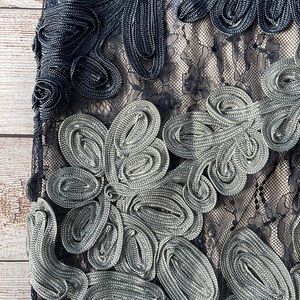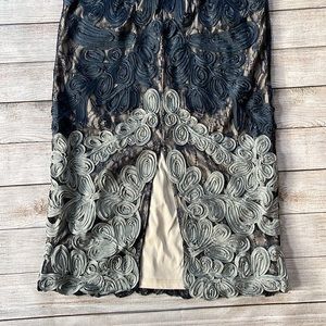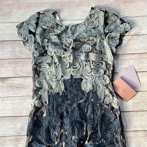 Dimensional soutache applique scrolls over a lacy foundation, bringing a chic color block effect to this sheath's slim silhouette. A high neck, cap sleeves, and a back slit finish the look.