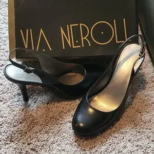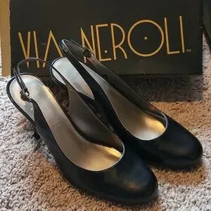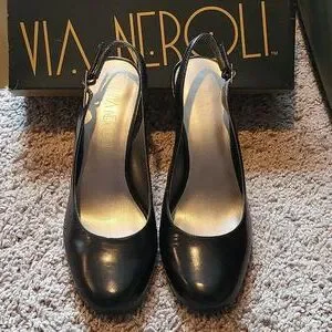 Via Neroli Deville women's size 8.5 slingback pump. Rounded toe area. Black leather.