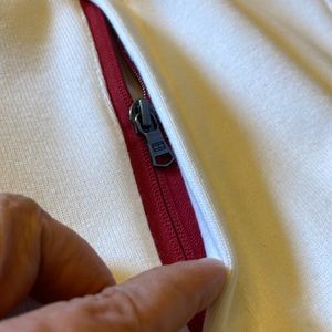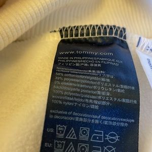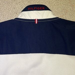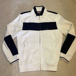 Tommy Hilfiger full zip jacket. Size Medium. White, blue and red. Embroidered logo. Two front zip pockets, one zip sleeve pocket and two inner pockets. Ribbed waistband and cuffs. Cotton fleece , poly and elastane. Beautiful preloved condition
