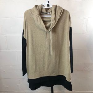 Hugs From Soft Surroundings Colorblock sweater, Cowl Neck with drawstring, drop shoulder Size PL Black Tan color. Thumb holes