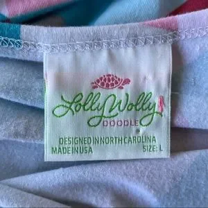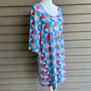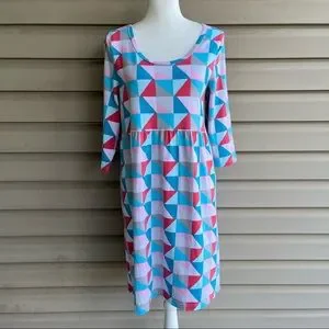 This is a three-quarter sleeved “Olivia” dress from Lolly Wolly Doodle, ladies size Large. The soft jersey knit fabric, 100% polyester, has a geometric pattern in shades of pink, turquoise, and gray. Features a scooped neckline for easy pullover style, and a flattering Empire waistline. This dress will be your new favorite addiction!